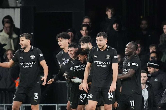 Para pemain Manchester City merayakan gol Phil Foden pada pertandingan Premier League melawan Fulham, Rabu, 3 Desember 2025. (c) AP Photo/Kirsty Wigglesworth