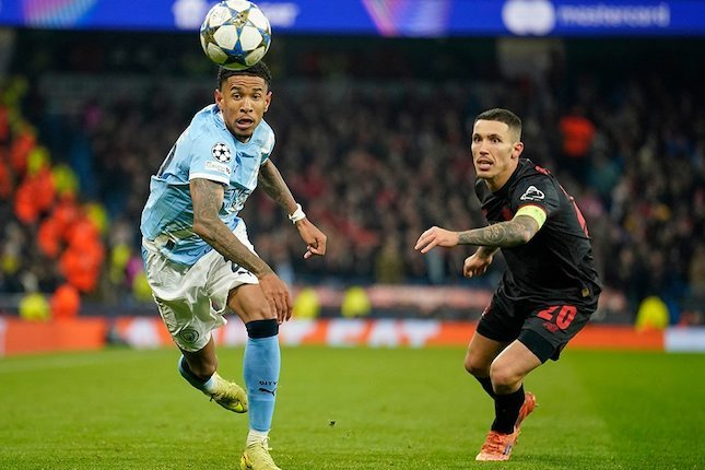 Savinho dan Alex Grimaldo berebut bola liar dalam laga Liga Champions antara Manchester City vs Bayer Leverkusen di Etihad Stadium, 26 November 2025 (c) AP Photo/Dave Thompson